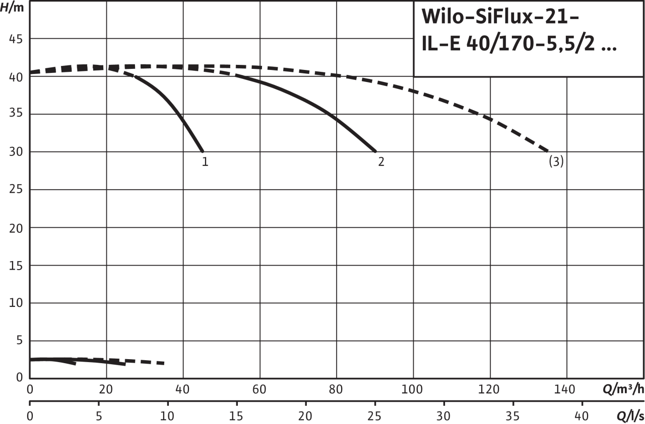 Эксплуатация всей системы SiFlux, включая резервный насос (штрихованная характеристика), в стандартном исполнении не предусмотрена. Резервный насос служит исключительно в качестве запасного агрегата при сбое одного из рабочих насосов (характеристика 1 и 2).