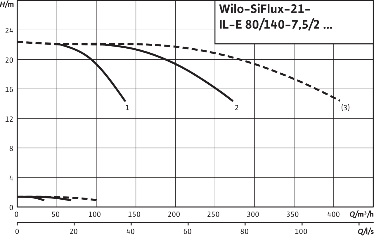 Эксплуатация всей системы SiFlux, включая резервный насос (штрихованная характеристика), в стандартном исполнении не предусмотрена. Резервный насос служит исключительно в качестве запасного агрегата при сбое одного из рабочих насосов (характеристика 1 и 2).