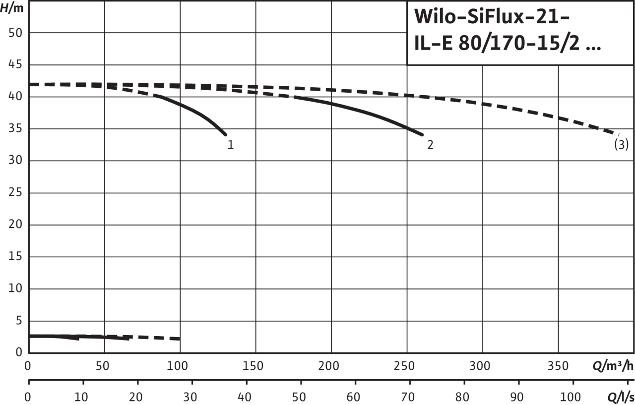 Эксплуатация всей системы SiFlux, включая резервный насос (штрихованная характеристика), в стандартном исполнении не предусмотрена. Резервный насос служит исключительно в качестве запасного агрегата при сбое одного из рабочих насосов (характеристика 1 и 2).