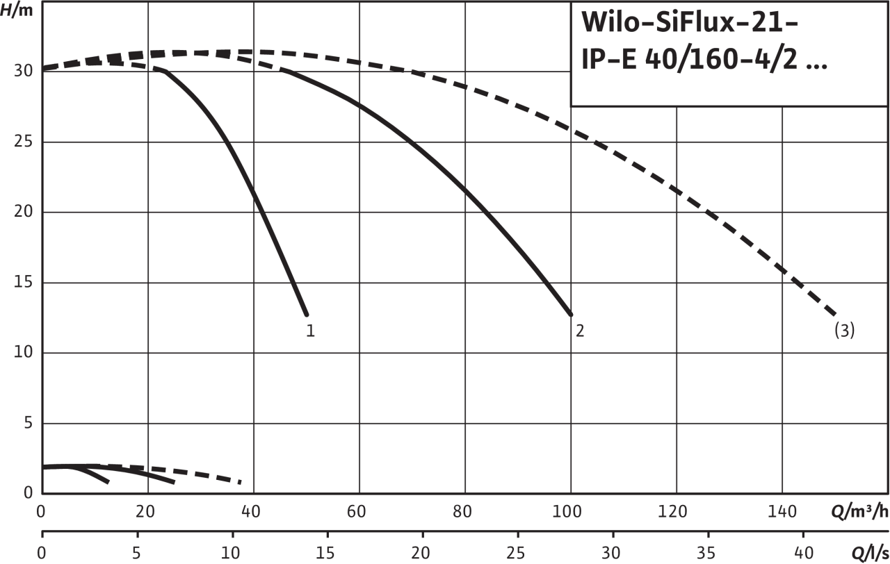 Эксплуатация всей системы SiFlux, включая резервный насос (штрихованная характеристика), в стандартном исполнении не предусмотрена. Резервный насос служит исключительно в качестве запасного агрегата при сбое одного из рабочих насосов (характеристика 1 и 2).