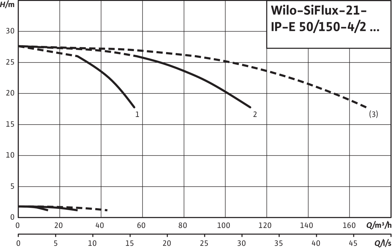 Эксплуатация всей системы SiFlux, включая резервный насос (штрихованная характеристика), в стандартном исполнении не предусмотрена. Резервный насос служит исключительно в качестве запасного агрегата при сбое одного из рабочих насосов (характеристика 1 и 2).