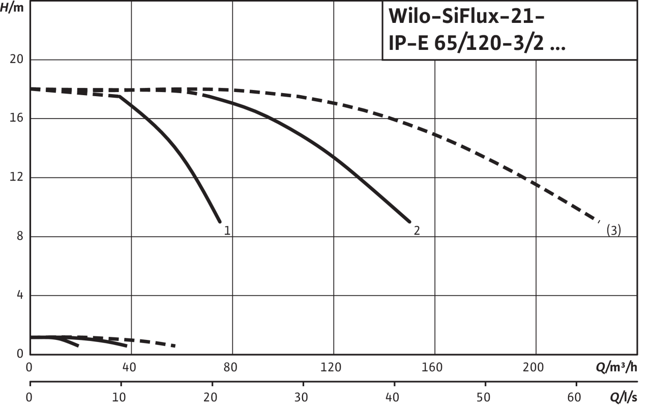 Эксплуатация всей системы SiFlux, включая резервный насос (штрихованная характеристика), в стандартном исполнении не предусмотрена. Резервный насос служит исключительно в качестве запасного агрегата при сбое одного из рабочих насосов (характеристика 1 и 2).