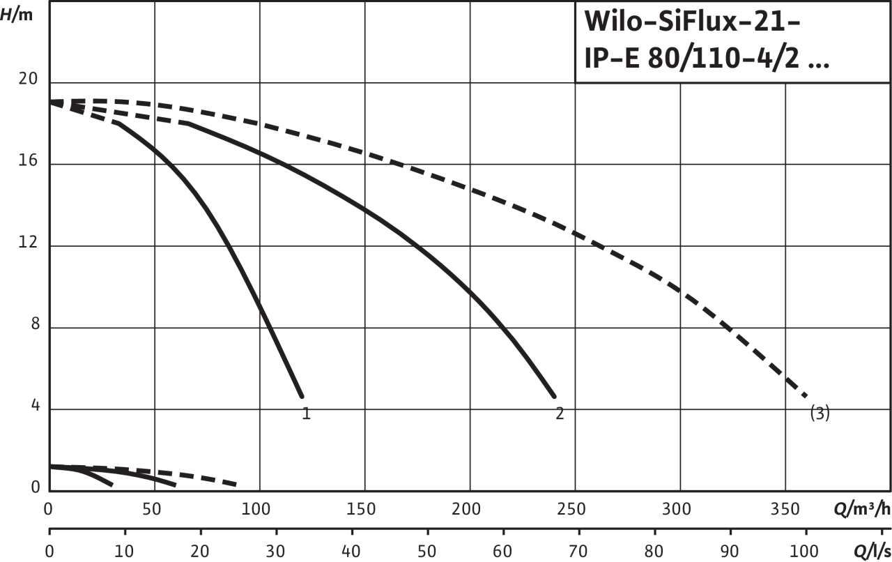 Эксплуатация всей системы SiFlux, включая резервный насос (штрихованная характеристика), в стандартном исполнении не предусмотрена. Резервный насос служит исключительно в качестве запасного агрегата при сбое одного из рабочих насосов (характеристика 1 и 2).