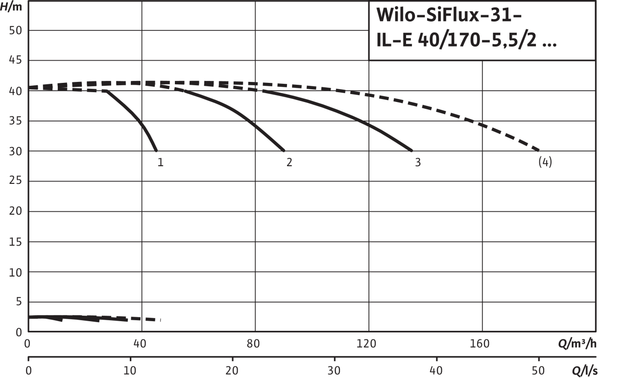 Эксплуатация всей системы SiFlux, включая резервный насос (штрихованная характеристика), в стандартном исполнении не предусмотрена. Резервный насос служит исключительно в качестве запасного агрегата при сбое одного из рабочих насосов (характеристика 1 и 2 и соответственно 3).