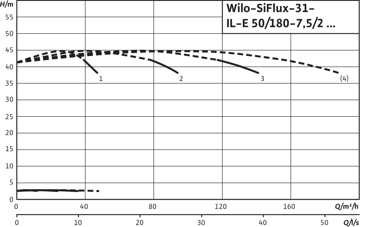 Эксплуатация всей системы SiFlux, включая резервный насос (штрихованная характеристика), в стандартном исполнении не предусмотрена. Резервный насос служит исключительно в качестве запасного агрегата при сбое одного из рабочих насосов (характеристика 1 и 2 и соответственно 3).