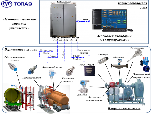 Централизованная система управления отличается от простой тем, что между полевыми контроллерами и оборудованием имеется центральный контроллер, который управляет нестандартным оборудованием, использование которого вызвано необходимостью его применения в данном проекте. В качестве программного обеспечения в этом случае в зависимости от сложности проекта возможно применение серийной версии «Топаз-нефтебаза» или индивидуально разработанного по технологии заказчика программного обеспечения на платформе 1С:Предприятие.