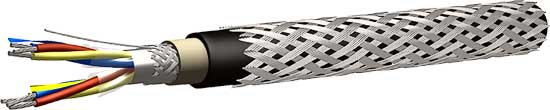 | Тройки с многопроволочными медными лужеными жилами сечением от 0,35 до 2,5 мм2 с изоляцией из сшитого полиэтилена, в экране из алюмолавсановой ленты с контактным проводником и в оплётке из медных лужёных проволок плотностью 40%. Оболочка из сшитой полимерной композиции, не содержащей галогенов. Броня в виде оплетки из стальных оцинкованных проволок. |