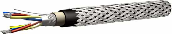 | Тройки с многопроволочными медными лужеными жилами сечением от 0,5 до 2,5 мм² с изоляцией из полимерной композиции пониженной пожарной опасности, в экране из алюмолавсановой ленты с контактным проводником и в оплётке из медных лужёных проволок плотностью 40%. Оболочка из ПВХ пластиката пониженной пожароопасности (СКАБ 250КГнг (А)-LS) или полимерной композиции, не содержащей галогенов (СКАБ 250КГнг (А)-HF-ХЛ). Броня в виде оплетки из стальных оцинкованных проволок. |