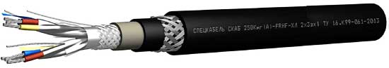 | Тройки с многопроволочными медными лужеными жилами сечением от 0,5 до 2,5 мм² с изоляцией из огнестойкой кремнийорганической резины, в индивидуальном экране из алюмолавсановой ленты с контактным проводником из медной лужёной проволоки; общий экран из алюмолавсановой ленты с контактным проводником из медной лужёной проволокии в оплётке из медных лужёных проволок плотностью 40%. Оболочка из ПВХ пластиката пониженной пожароопасности (СКАБ 250Кнг (А)-FRLS), полимерной композиции, не содержащей галогенов (СКАБ 250Кнг (А)-FRHF-ХЛ) или безгалогенного термопластичного полиуретана (СКАБ 250КУнг©-FRHF-ХЛ). Броня в виде оплетки из стальных оцинкованных проволок. Защитный шланг из ПВХ пластиката пониженной пожароопасности (СКАБ 250Кнг (А)-FRLS), полимерной композиции, не содержащей галогенов (СКАБ 250Кнг (А)-FRHF-ХЛ) или безгалогенного термопластичного полиуретана (СКАБ 250КУнг©-FRHF-ХЛ). |