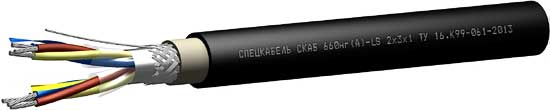 | Тройки с многопроволочными медными лужеными жилами сечением от 0,5 до 2,5 мм² с изоляцией из полимерной композиции пониженной пожарной опасности, в экране из алюмолавсановой ленты с контактным проводником и в оплётке из медных лужёных проволок плотностью 40%. Оболочка из ПВХ пластиката пониженной пожароопасности (СКАБ 660нг (А)-LS) или полимерной композиции, не содержащей галогенов (СКАБ 660нг (А)-HF-ХЛ). |