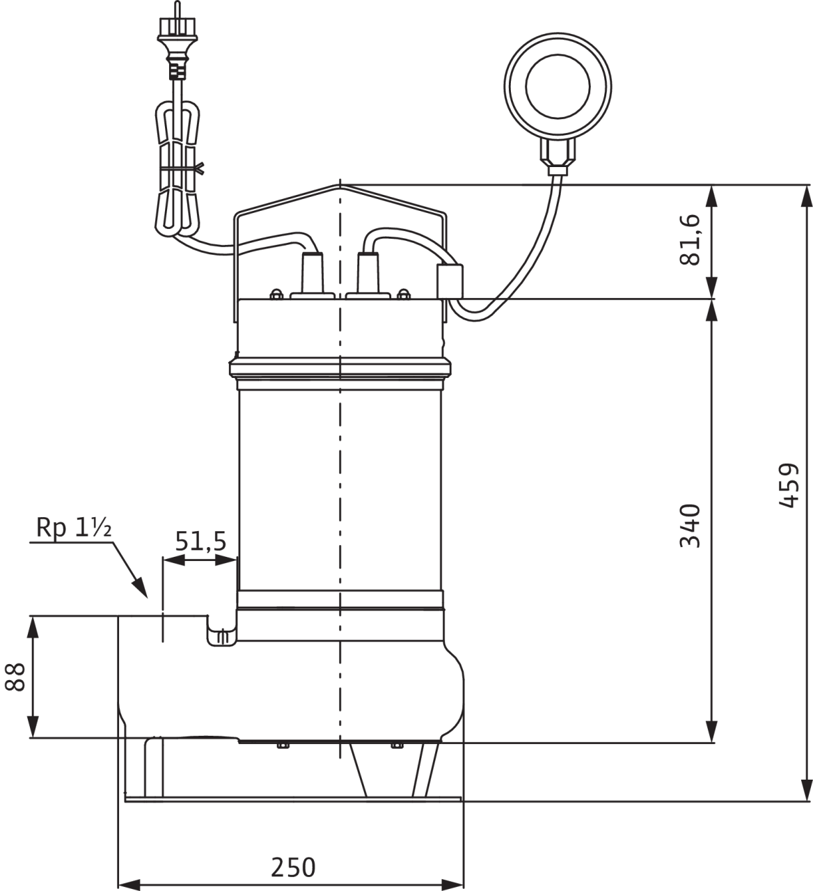 Погружной блочный агрегат для вертикальной установки в погруженном состоянии для перекачивания загрязненных и сточных вод. Насос с вертикальным напорным патрубком и внутренней резьбой. Электродвигатель со защитой от перегрева (автоматическое повторное включение после охлаждения электродвигателя), установленным поплавковым выключателем и разъемным соединительным кабелем со штекером с защитным контактом.