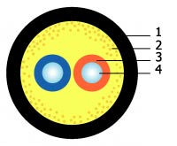 | | 4 волокна: 1 - Внешняя оболочка 2 - Упрочняющие нити 3 - Буфер 4 - Оптическое волокно |