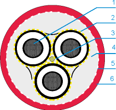 | Число жил X ном.поперечное сечение мм2 | Сопрот ивление главных жил при 20 °С макс. Ом/км | Индукт. сопротивление при 50 Гц, ок. ок. Ом/км | Емкость, главная жила -заземление, ок. ок. Ом/км | Номинальный ток, приложенный напрямую А, при температуре 30°С | Допуст. ток короткого замыкания кА | Макс. допустимая растягивающая нагрузка Max. permissible tensile load Стат. Динам. Н Н |