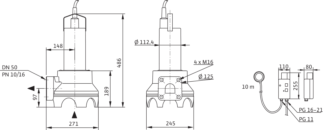 Полностью погружной дренажный насос для отвода сточных вод в виде блочного агрегата для вертикальной установки в погруженном состоянии для перекачивания загрязненной воды. Гидравлический корпус и рабочее колесо из синтетического материала, корпус электродвигателя из нержавеющей стали. Напорный патрубок с горизонтальным напорным патрубком и фланцевым соединением. Электродвигатель насоса с сухим ротором в исполнении для трехфазного тока с защитой от перегрева и разъемным соединительным кабелем длиной 10 м с поплавковым выключателем и штекером CEE. Сертификат взрывозащиты отсутствует у всех агрегатов.