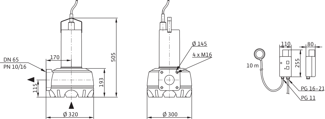 Полностью погружной дренажный насос для отвода сточных вод в виде блочного агрегата для вертикальной установки в погруженном состоянии для перекачивания загрязненной воды. Гидравлический корпус и рабочее колесо из синтетического материала, корпус электродвигателя из нержавеющей стали. Напорный патрубок с горизонтальным напорным патрубком и фланцевым соединением. Электродвигатель насоса с сухим ротором в исполнении для трехфазного тока с защитой от перегрева и разъемным соединительным кабелем длиной 10 м с поплавковым выключателем и штекером CEE. Сертификат взрывозащиты отсутствует у всех агрегатов.