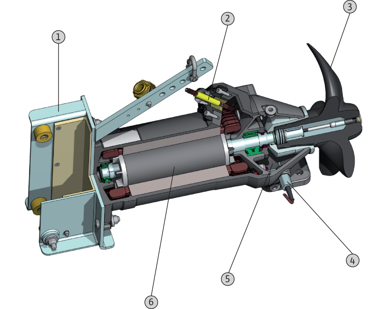 1 = рама, 2 = кабель, 3 = пропеллер, 4 = винты слива масла и маслоналивные пробки, а также устройство контроля герметичности камеры уплотнений (в качестве опции), 5 = камера уплотнений, 6 = электродвигатель