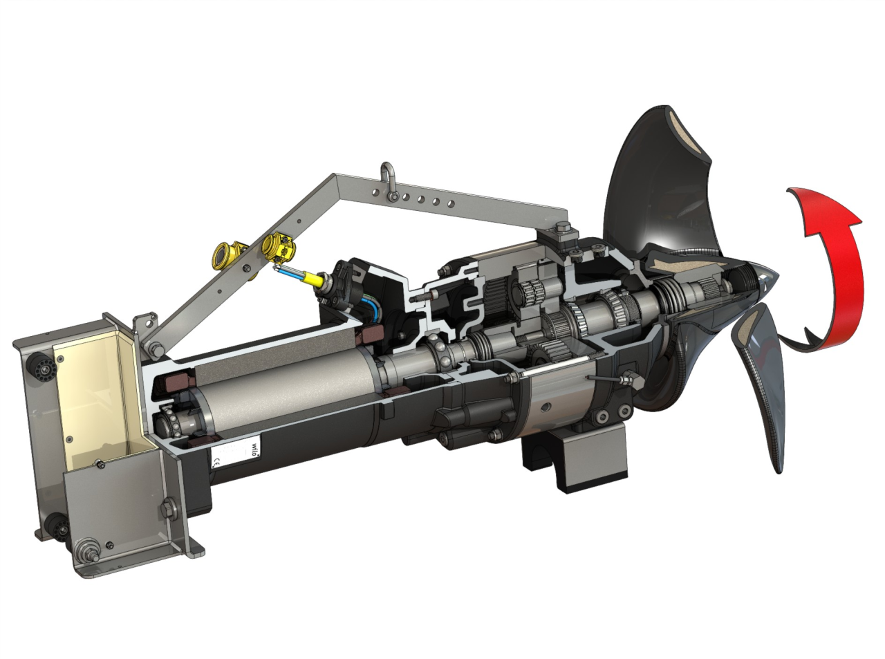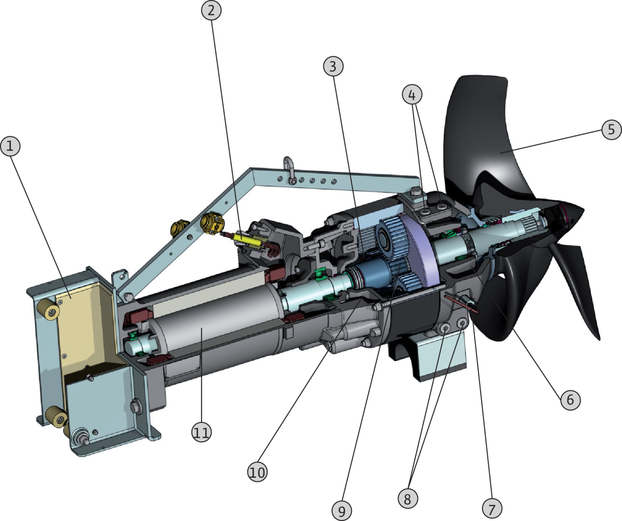 1 = рама, 2 = кабель, 3 = камера привода, 4 = маслоналивные пробки, 5 = пропеллер, 6 = форкамера, 7 = устройство контроля герметичности камеры уплотнений (в качестве опции), 8 = винты слива масла, 9 = планетарный редуктор, 10 = камера уплотнений, 11 = электродвигатель