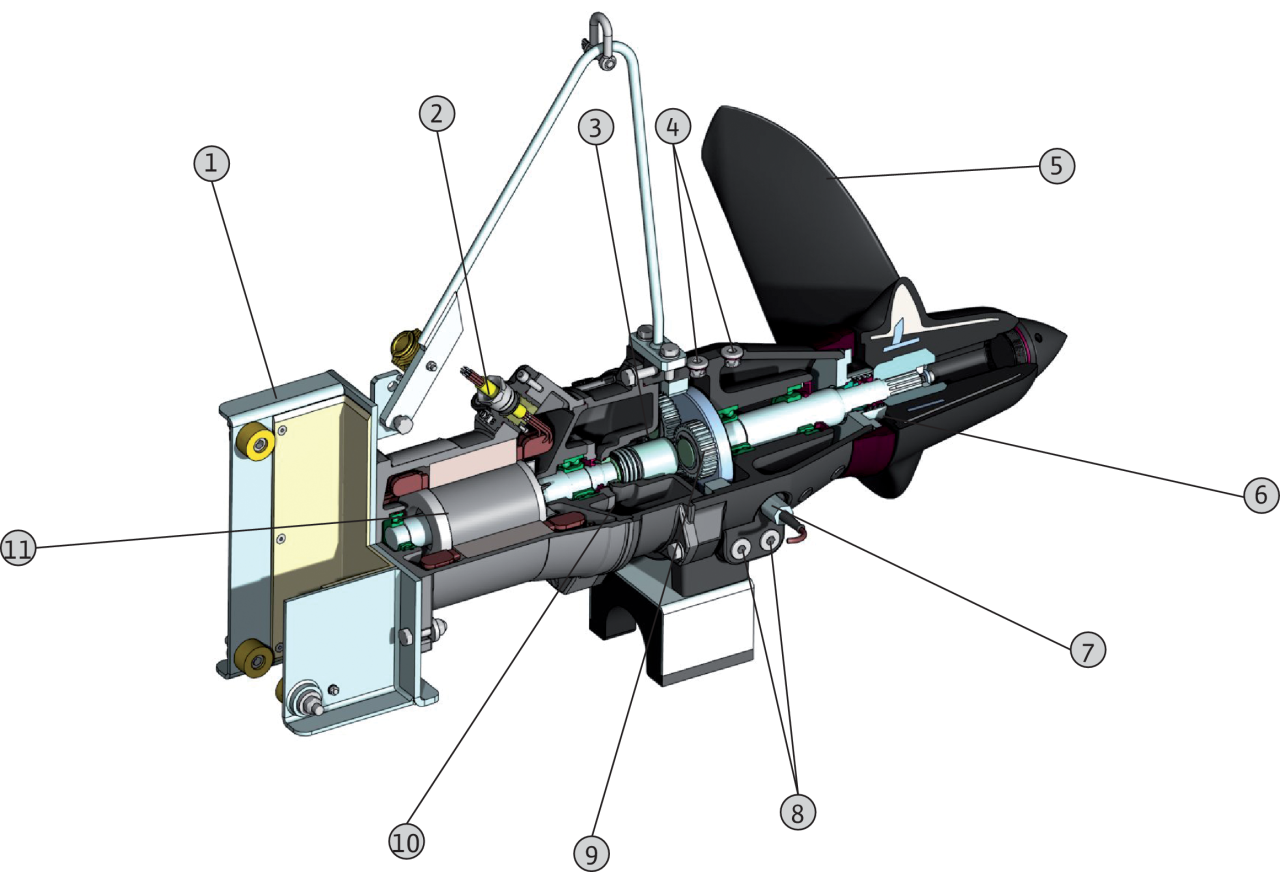 1 = рама, 2 = кабель, 3 = камера привода, 4 = маслоналивные пробки, 5 = пропеллер, 6 = форкамера, 7 = устройство контроля герметичности камеры уплотнений (в качестве опции), 8 = винты слива масла, 9 = планетарный редуктор, 10 = камера уплотнений, 11 = электродвигатель