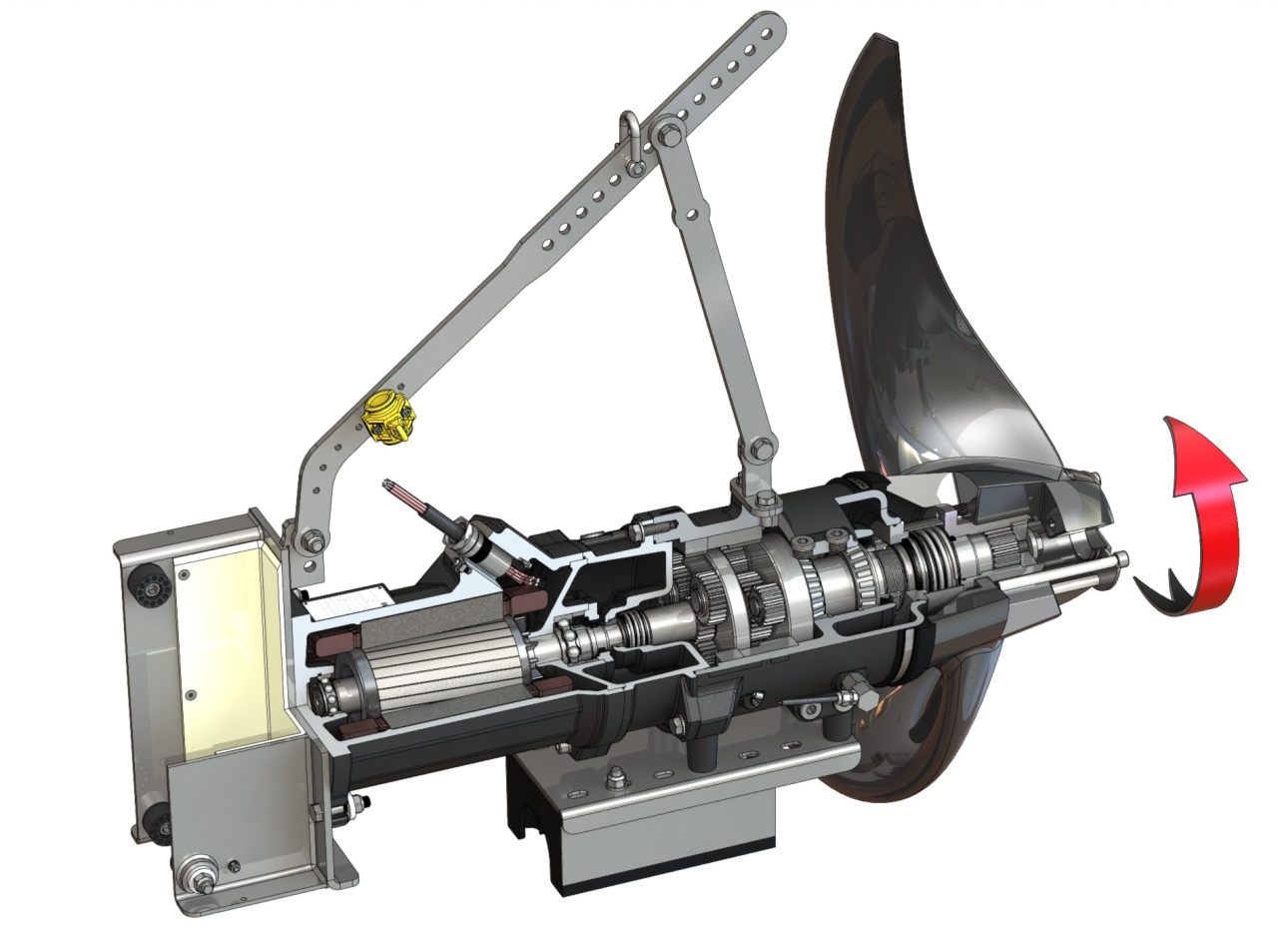 1 = рама, 2 = кабель, 3 = камера привода, 4 = маслоналивные пробки, 5 = пропеллер, 6 = форкамера, 7 = устройство контроля герметичности камеры уплотнений (в качестве опции), 8 = винты слива масла, 9 = планетарный редуктор, 10 = камера уплотнений, 11 = электродвигатель, 12 = замыкающее кольцо ступицы