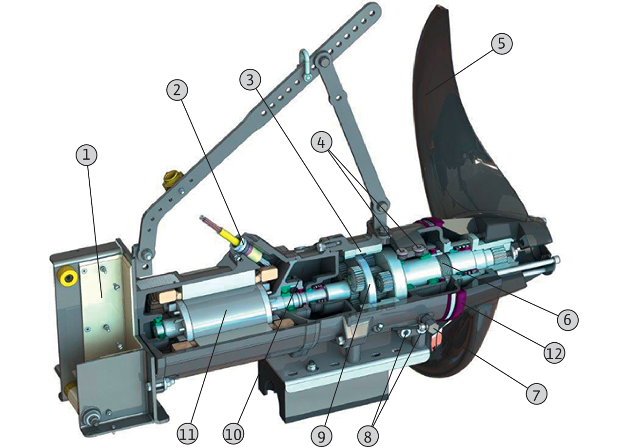 1 = рама, 2 = кабель, 3 = камера привода, 4 = маслоналивные пробки, 5 = пропеллер, 6 = форкамера, 7 = устройство контроля герметичности камеры уплотнений (в качестве опции), 8 = винты слива масла, 9 = планетарный редуктор, 10 = камера уплотнений, 11 = электродвигатель, 12 = замыкающее кольцо ступицы