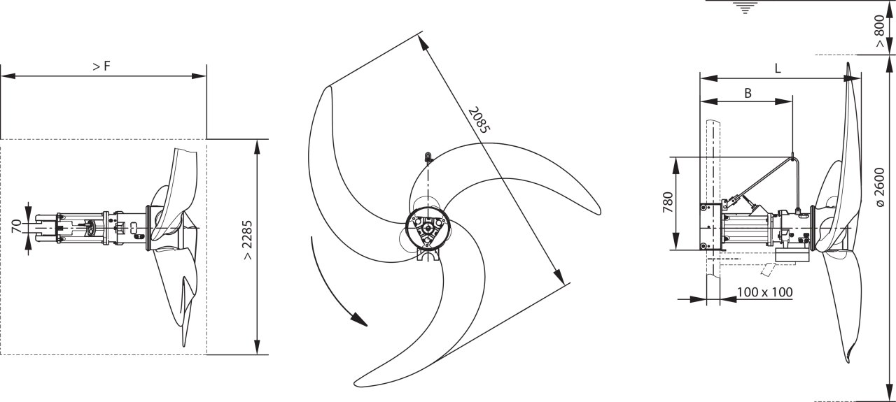 Тип пропеллера3-лопастный пропеллер с самоочищающейся ступицей; изогнут в обратном направлении; благодаря этому защищен от засорения и наматывания