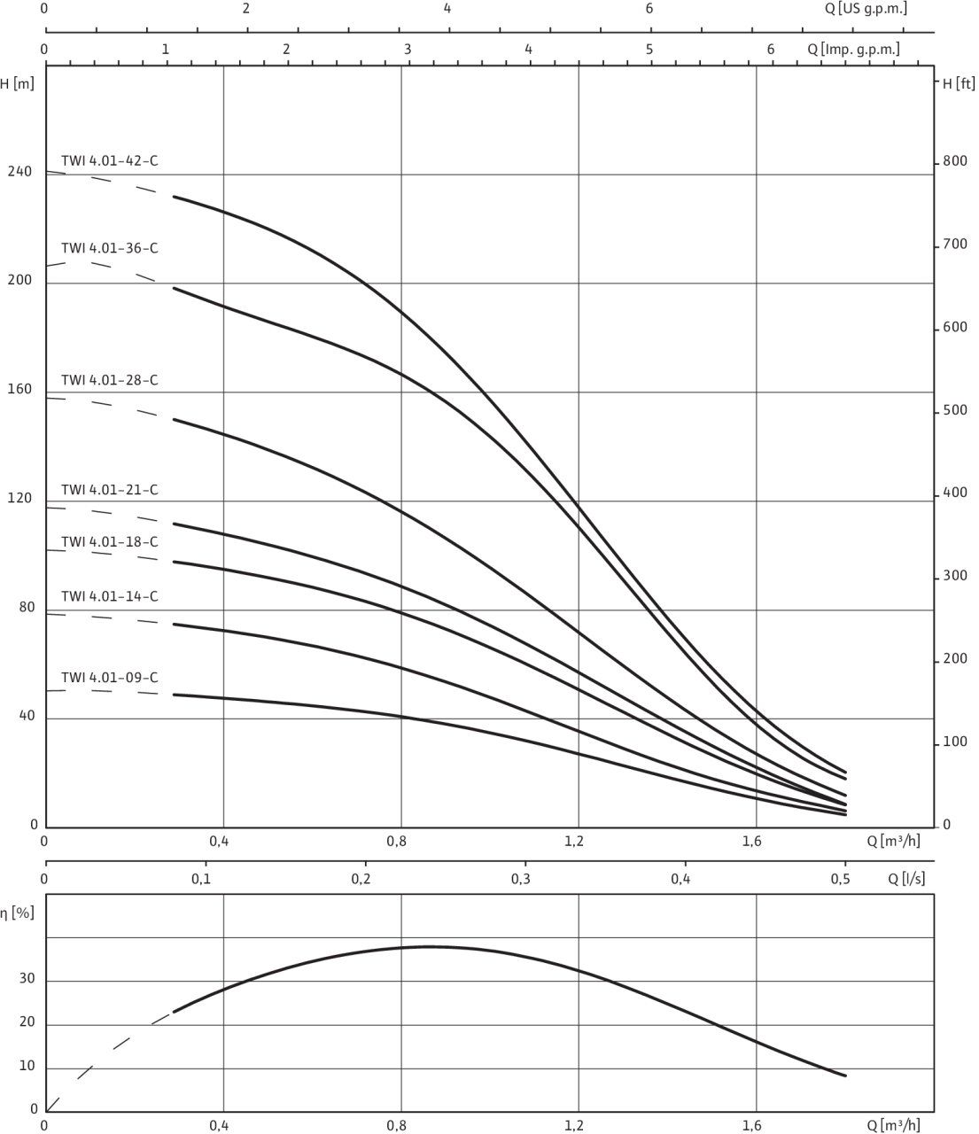 Технический паспорт Характеристики Wilo-Sub TWI 4.01 3~400 В, 50 Гц, p = 1 кг/дм 3 , v = 1x10 -6 м 2 /с, ISO 9906 приложение A, η = КПД насоса Агрегат Макс. расход Q max 1.8 м3/ч Макс. напор H max 228 M Макс. содержание песка ПЃ 50 г/м3 Минимальный индекс эффективности...