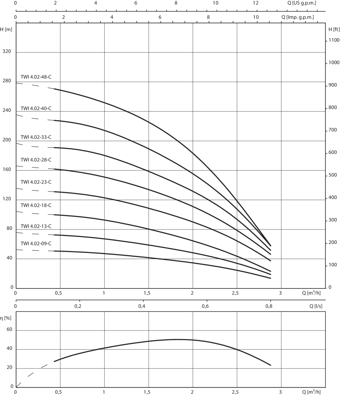 Технический паспорт Характеристики Wilo-Sub TWI 4.02 3~400 В, 50 Гц, p = 1 кг/дм 3 , v = 1x10 -6 м 2 /с, ISO 9906 приложение A, η = КПД насоса Агрегат Макс. расход Q max 2.9 м3/ч Макс. напор H max 50 M Макс. содержание песка ПЃ 50 г/м3 Минимальный индекс эффективности...