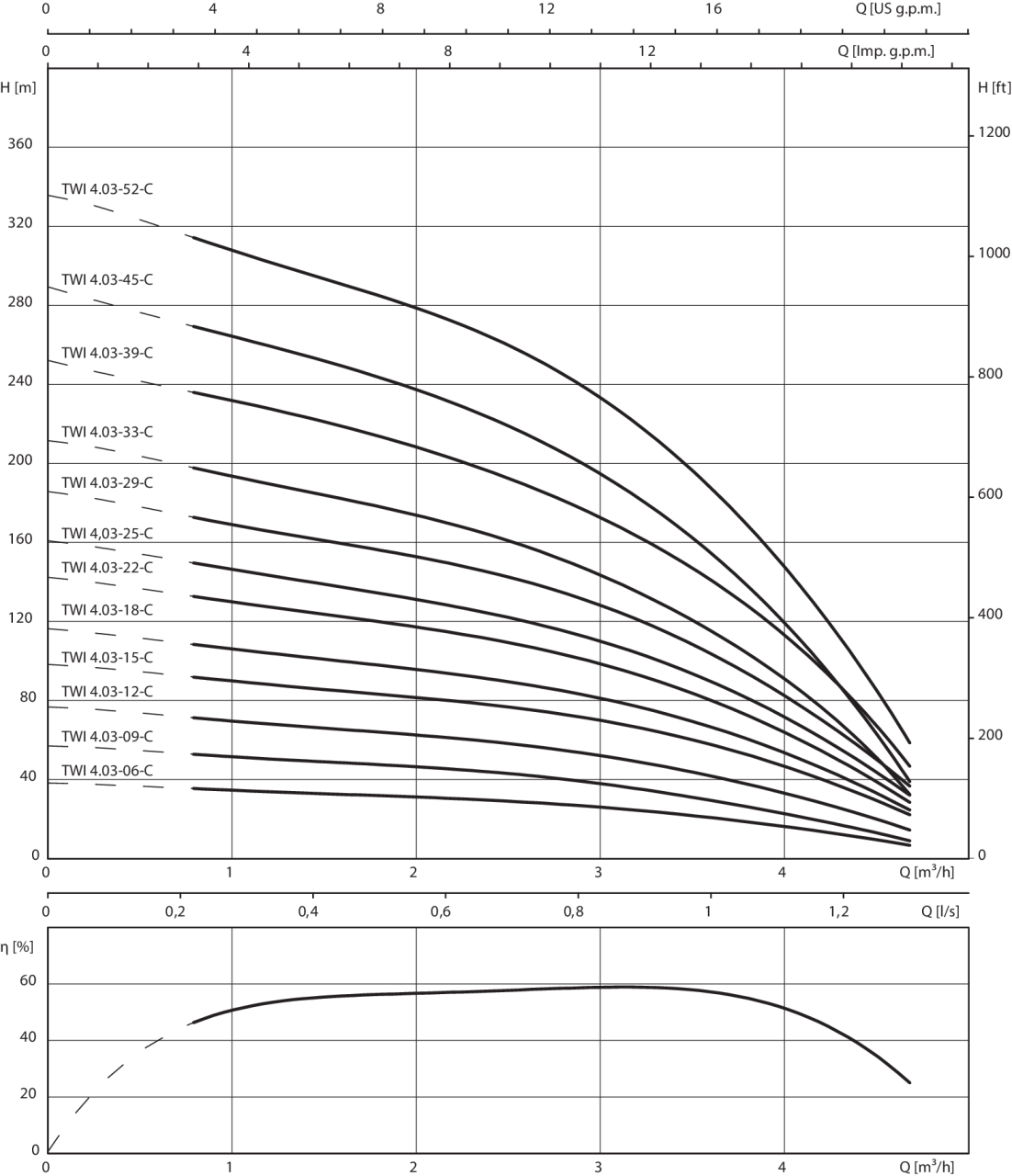 3~400 В, 50 Гц, p = 1 кг/дм3, v = 1x10-6 м2/с, ISO 9906 приложение A, η = КПД насоса