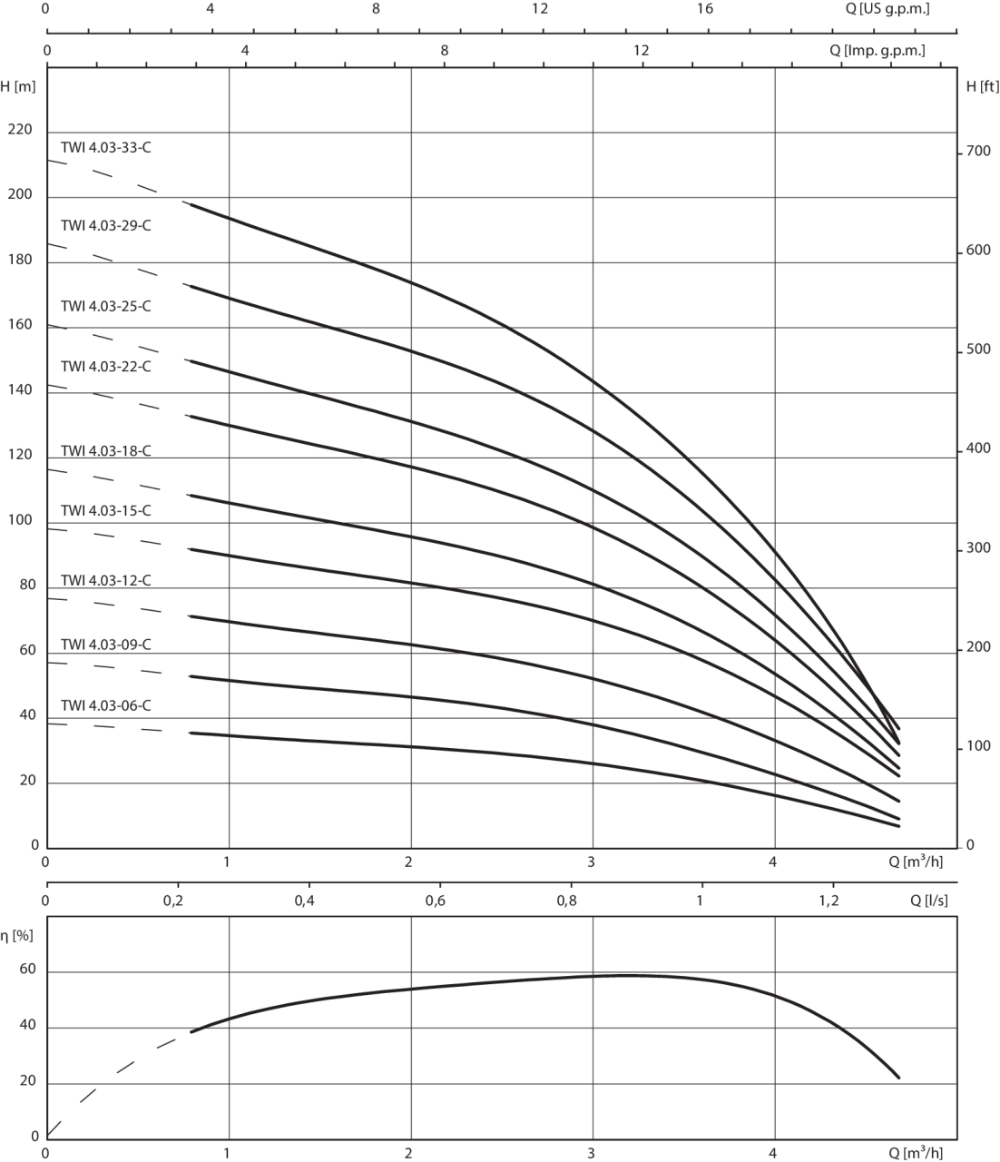 Технический паспорт Характеристики Wilo-Sub TWI 4.03 (1~230 V) 1~230 В, 50 Гц, p = 1 кг/дм 3 , v = 1x10 -6 м 2 /с, ISO 9906 приложение A, η = КПД насоса Агрегат Макс. расход Q max 4.7 м3/ч Макс. напор H max 70 M Макс. содержание песка ПЃ 50 г/м3 Минимальный индекс...