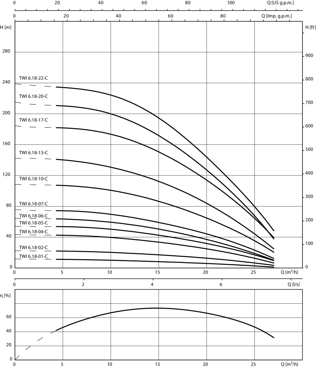 Технический паспорт Характеристики Wilo-Sub TWI 6.18 3~400 В, 50 Гц, p = 1 кг/дм 3 , v = 1x10 --6 м 2 /с, ISO 9906 приложение A Агрегат Макс. расход Q max 27 м3/ч Макс. напор H max 238 M Макс. содержание песка ПЃ 50 г/м3 Минимальный индекс эффективности (MEI)...