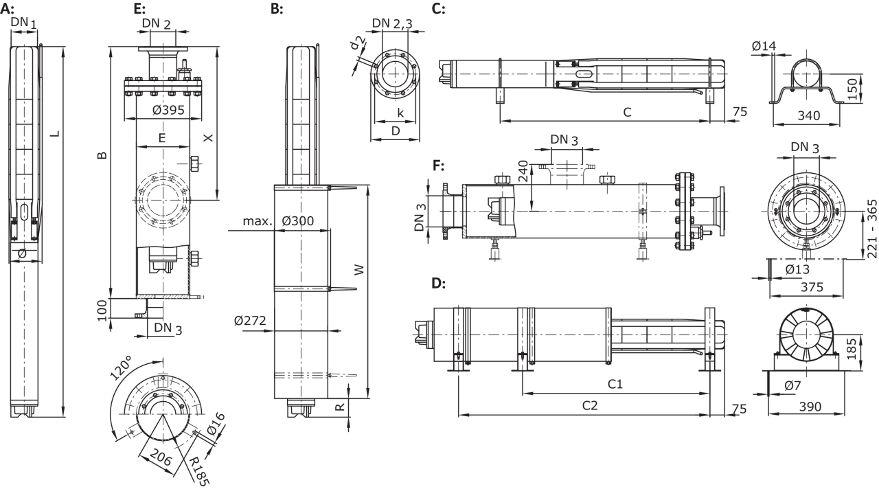 A = вертикально, B = вертикально с охлаждающим кожухом, C = горизонтально, D = горизонтально с охлаждающим кожухом, E = вертикально с напорным кожухом, F = горизонтально с напорным кожухом