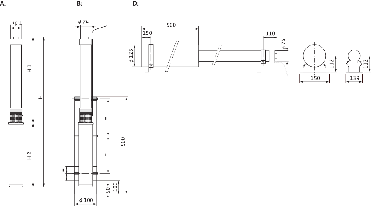 Полностью погружной многоступенчатый насос с радиальными рабочими колесами в секционном исполнении для вертикального или горизонтального монтажа со встроенным обратным клапаном. Стойкий к коррозии электродвигатель прямого пуска для однофазного или трехфазного тока, с заполненным маслом электродвигателем с возможностью перемотки и самосмазывающимися подшипниками. Охлаждение электродвигателя происходит за счет перекачиваемой жидкости. Этот агрегат всегда должен эксплуатироваться в погруженном состоянии. Горизонтальный монтаж выполняется с охлаждающим кожухом. Для перекачивания воды из скважины с максимальной глубиной погружения 150 м и максимальным содержанием песка 50 г/м³.