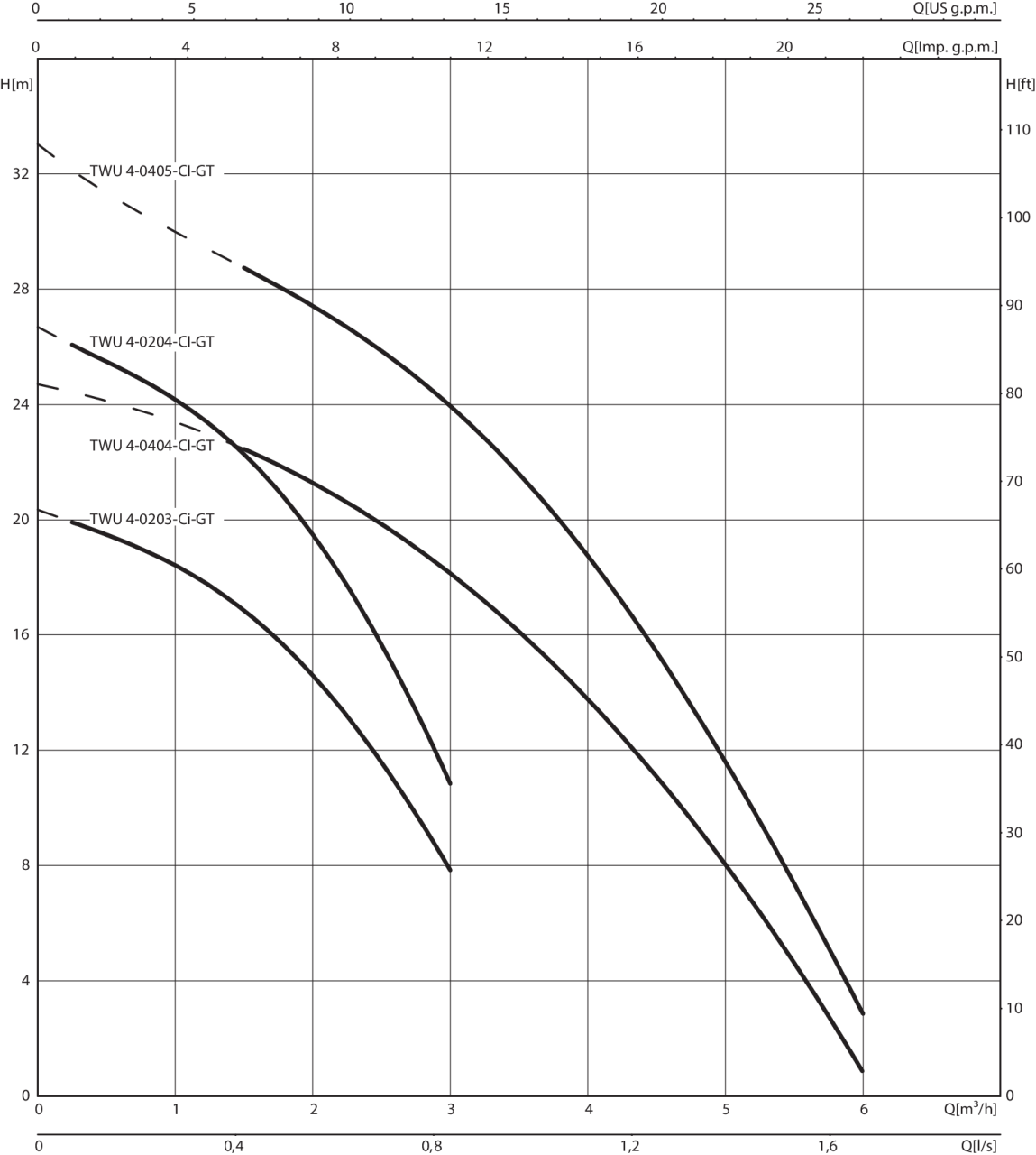 3~400 В, 50 Гц, p = 1 кг/дм3, v = 1x10-6 м2/с, ISO 9906 приложение A