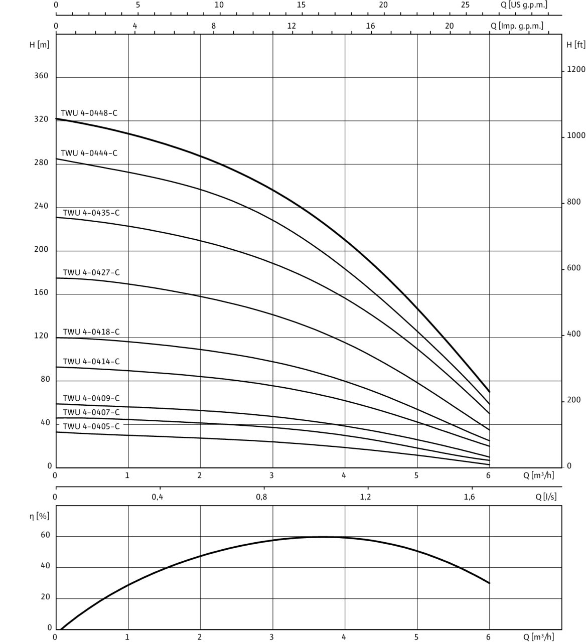 Полностью погружной многоступенчатый насос с радиальными или полуосевыми рабочими колесами в секционном исполнении для вертикального или горизонтального монтажа со встроенным обратным клапаном. Стойкий к коррозии электродвигатель однофазного или трехфазного тока для прямого пуска с водогликолевой смесью. Полностью герметичные и пропитанные смолой самосмазывающиеся подшипники с обмоткой с изолирующей лакировкой. Охлаждение электродвигателя происходит за счет перекачиваемой жидкости. Этот агрегат всегда должен эксплуатироваться в погруженном состоянии. Горизонтальный монтаж выполняется с охлаждающим кожухом. Для перекачивания воды из скважин с максимальной глубиной погружения 200 м и максимальным содержанием песка 50 г/м³.
