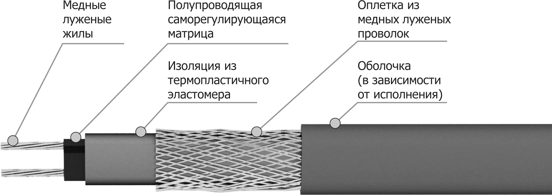 Автоматическое регулирование тепловыделения при изменении температуры обогреваемой по- верхности Может быть отрезана нужной длины благодаря использованию параллельного типа проводника |
