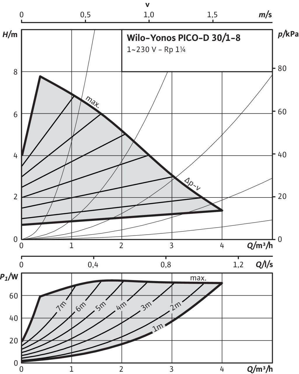 Технический паспорт Характеристики Δp-v (перемен.) работа одного насоса Габаритный чертеж Схема подключения Допустимая перекачиваемая среда (другие среды по запросу) Вода систем отопления (согласно VDI 2035) • Водогликолевая смесь...
